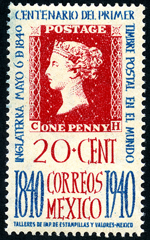 Para más información favor de dirigirse a biblioteca@mufi.org.mx No. Scott: 756 -- Año de Emisión: 1940 -- Valor facial: Veinte Centavos -- Variedad de color: Azul y Rojo -- Perforación: 14 -- Tipo de impresión: Grabado Timbre Postal Mexicano en colores azul y rojo, en la imagen se observa el perfíl de la Reina Victoria de Inglaterra, en el contorno del timbre aparece escrito "INGLATERRA MAYO 6 DE 1840", "CENTENARIO DEL PRIMER TIMBRE POSTAL EN EL MUNDO", en la parte inferior el valor facial de "20 CENTAVOS" y "CORREOS MEXICO"