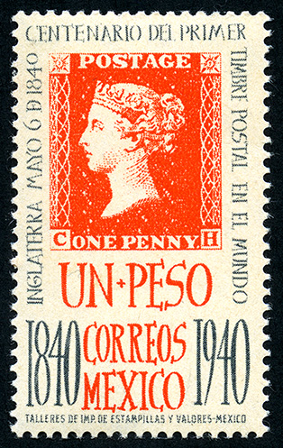 Para más información favor de dirigirse a biblioteca@mufi.org.mx No. Scott: 757 -- Año de Emisión: 1940 -- Valor facial: Un Peso -- Variedad de color: Gris y Bermellón -- Perforación: 14 -- Tipo de impresión: Grabado Timbre Postal Mexicano en colores gris y bermellón, en la imagen se observa el perfíl de la Reina Victoria de Inglaterra, en el contorno del timbre aparece escrito "INGLATERRA MAYO 6 DE 1840", "CENTENARIO DEL PRIMER TIMBRE POSTAL EN EL MUNDO", en la parte inferior el valor facial de " UN PESO" y "CORREOS MEXICO"