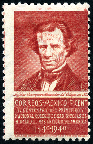 Para más información favor de dirigirse a biblioteca@mufi.org.mx No. Scott: 761 -- Año de Emisión: 1940 -- Valor facial: Cinco Centavos -- Variedad de color: Rojo Oscuro -- Perforación: 14 -- Tipo de impresión: Grabado Timbre Postal Mexicano en color rojo oscuro, en la imagen se observa a Melchor Ocampo, restaurador del Colegio de San Nicolás, en la parte inferior aparece escrito "CORREOS MEXICO- 5 CENTAVOS" y IV CENTENARIO DEL PRIMITIVO Y NACIONAL COLEGIO DE SAN NICOLÁS DE HIDALGO, EL MÁS ANTIGUO DE AMÉRICA".