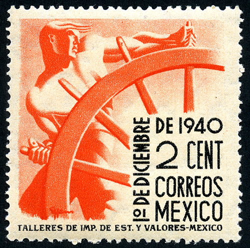 Para más información favor de dirigirse a biblioteca@mufi.org.mx No. Scott: 764 -- Año de Emisión: 1940 -- Valor facial: Dos Centavos -- Variedad de color: Naranja y Negro -- Perforación: 12x13 y 13x12 -- Tipo de impresión: Grabado Timbre Postal Mexicano en colores naranja y negro, en la imagen se observa a una persona del sexo masculino sujetando una rueda, la que a mi parecer, podría ser el timón de un barco,en la parte inferior del lado derecho aparece escrito "1o. DE DICIEMBRE DEL 1940", "CORREOS MEXICO" y el valor facial de "2 CENTAVOS".
