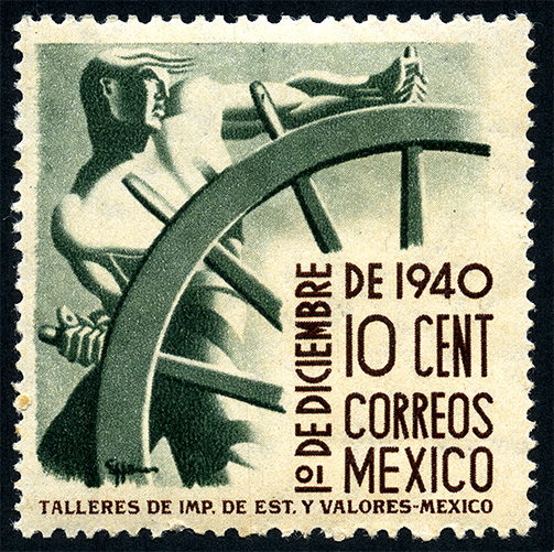Para más información favor de dirigirse a biblioteca@mufi.org.mx No. Scott: 766 -- Año de Emisión: 1940 -- Valor facial: Diez Centavos -- Variedad de color: Verde Pizarra y Café Oscuro -- Perforación: 12x13 y 13x12 -- Tipo de impresión: Grabado Timbre Postal Mexicano en colores verde pizarra y café oscuro, en la imagen se observa a una persona del sexo masculino sujetando una rueda, la que a mi parecer, podría ser el timón de un barco,en la parte inferior del lado derecho aparece escrito "1o. DE DICIEMBRE DEL 1940", "CORREOS MEXICO" y el valor facial de "10 CENTAVOS".