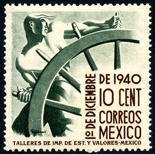 Para más información favor de dirigirse a biblioteca@mufi.org.mx No. Scott: 766 -- Año de Emisión: 1940 -- Valor facial: Diez Centavos -- Variedad de color: Verde Pizarra y Café Oscuro-- Perforación: 12x13 y 13x12 -- Tipo de impresión: Grabado Timbre Postal Mexicano en colores verde pizarra y café oscuro, en la imagen se observa a una persona del sexo masculino sujetando una rueda, la que a mi parecer, podría ser el timón de un barco,en la parte inferior del lado derecho aparece escrito "1o. DE DICIEMBRE DEL 1940", "CORREOS MEXICO" y el valor facial de "10 CENTAVOS".