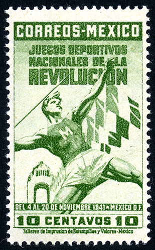 Para más información favor de dirigirse a biblioteca@mufi.org.mx No. Scott: 767 -- Año de Emisión: 1941 -- Valor facial: Diez Centavos -- Variedad de color: Verde Amarillo -- Perforación: 12x13 y 13x12 -- Tipo de impresión: Grabado Timbre Postal Mexicano en color verde amarillo, en la imagen se observa a un deportista del sexo masculino lanzando, lo que a mi parecer pudiera ser una jabalina, en la parte superior aparece escrito "CORREOS-MEXICO", "JUEGOS DEPORTIVOS NACIONALES DE LA REVOLUCION" y en la parte inferior "DEL 4 AL 20 DE NOVIEMBRE 1941-MEXICO D.F." y el valor facial de "10 CENTAVOS ".