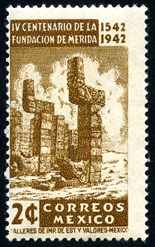 Para más información favor de dirigirse a biblioteca@mufi.org.mx No. Scott: 768 -- Año de Emisión: 1942 -- Valor facial: Dos Centavos -- Variedad de color: Café Olivo -- Perforación: 14 -- Tipo de impresión: Grabado Timbre Postal Mexicano en color café olivo, en la imagen se observan algunas columnas de una ciudad prehispánica, en la parte superior aparece escrito"IV CENTENARIO DE LA FUNDACION DE MERIDA 1542-1942" y en la parte inferior "CORREOS MEXICO" y el valor facial de "2 CENTAVOS ".