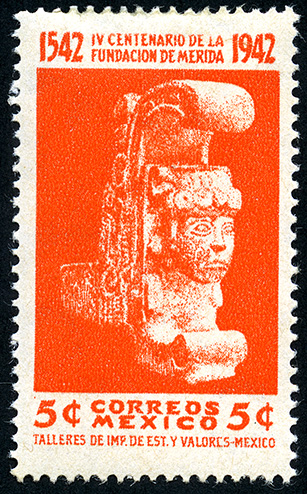 Para más información favor de dirigirse a biblioteca@mufi.org.mx No. Scott: 769 -- Año de Emisión: 1942 -- Valor facial: Cinco Centavos -- Variedad de color: Bermellón -- Perforación: 14 -- Tipo de impresión: Grabado Timbre Postal Mexicano en color bermellón, en la imagen se observa una escultura prehispánica, en la parte superior aparece escrito"IV CENTENARIO DE LA FUNDACION DE MERIDA 1542-1942" y en la parte inferior "CORREOS MEXICO" y el valor facial de "2 CENTAVOS ".