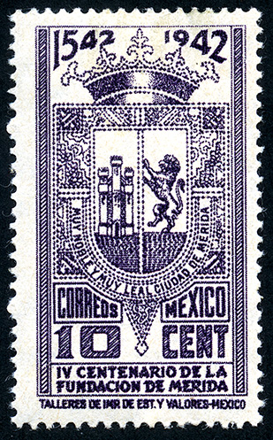 Para más información favor de dirigirse a biblioteca@mufi.org.mx No. Scott: 770 -- Año de Emisión: 1942 -- Valor facial: Diez Centavos -- Variedad de color: Violeta -- Perforación: 14 -- Tipo de impresión: Grabado Timbre Postal Mexicano en color violeta, en la imagen se observa el escudo de la Ciudad de Mérida, en la parte superior aparece el periodo de 1542 a 1942, en la parte inferior "CORREOS MEXICO", "10 CENTAVOS" y "IV CENTENARIO DE LA FUNDACION DE MERIDA".
