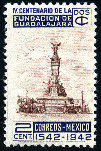 Para más información favor de dirigirse a biblioteca@mufi.org.mx No. Scott: 771 -- Año de Emisión: 1942 -- Valor facial: Dos Centavos -- Variedad de color: Azul Violáceo y Café -- Perforación: 10 x 10 1/2 -- Tipo de impresión: Grabado Timbre Postal Mexicano en colores azul violáceo y café, en la imagen se observa un monumento a Hidalgo, en la parte superior aparece escrito "IV CENTENARIO DE LA FUNDACION DE GUADALAJARA", "DOS C. y en la parte inferior "CORREOS MEXICO", "1542-1942" y el valor facial con número.