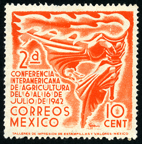 Para más información favor de dirigirse a biblioteca@mufi.org.mx No. Scott: 779 -- Año de Emisión: 1942 -- Valor facial: Diez Centavos -- Variedad de color: Bermellón -- Perforación: 12 x 13 -- Tipo de impresión: Grabado Timbre Postal Mexicano en color bermellón, en la imagen se observan dos manos sujetando una antorcha encendida, en la parte inferior del lado izquierdo aparece escrito "II CONFERENCIA INTERAMERICANA DE AGRICULTURA del 6 al 16 de Julio de 1942" y del lado derecho el valor facial de "10 CENT".