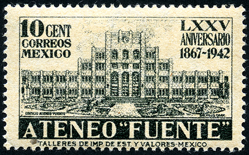 Para más información favor de dirigirse a biblioteca@mufi.org.mx No. Scott: 780 -- Año de Emisión: 1942 -- Valor facial: Diez Centavos -- Variedad de color: Verde Pizarra Oscuro -- Perforación: 14 -- Tipo de impresión: Grabado Timbre Postal Mexicano en color verde pizarra oscuro, en la imagen se observa la fachada de un edificio histórico, en la parte superior aparece escrito "10 CENT" "CORREOS MEXICO". y en la parte inferior "ATENEO FUENTE".