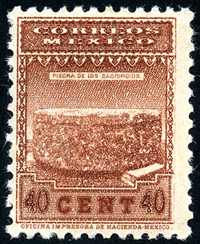 Piedra de los Sacrificios -- Con marca de Agua: S.H.C.P. MEXICO Y ÁGUILA EN CIRCULO (XIV) -- Litografiado -- Con Perforación -- Cuarenta Centavos -- Café