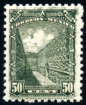 Ruinas de Mitla -- Con marca de Agua: S.H.C.P. MEXICO Y ÁGUILA EN CIRCULO (XIV) -- Litografiado -- Con Perforación -- Cincuenta Centavos -- Verde Oscuro
