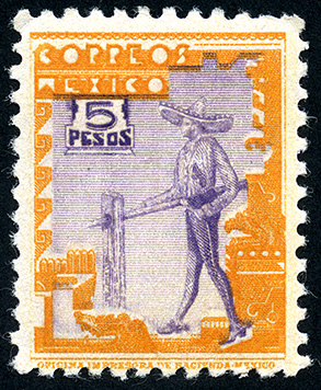 Para más información favor de dirigirse a biblioteca@mufi.org.mx No. Scott: 800 A -- Año de Emisión: 1945 -- Valor facial: Cinco Pesos -- Variedad de color: Naranja Violeta -- Perforación: 10 1/2 -- Tipo de impresión: Grabado Timbre Postal Mexicano en colores naranja y violeta, en él se observa a una persona del sexo masculino, vestido con sombrero ancho, pantalón, chaqueta y zapatos, en la parte superior aparece escrito "CORREOS MEXICO" y el valor facial de "5 CENTAVOS".