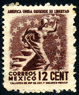 Para más información favor de dirigirse a biblioteca@mufi.org.mx No. Scott: 790 -- Año de Emisión: 1944 -- Valor facial: Doce Centavos -- Variedad de color: Café -- Perforación: 14 -- Tipo de impresión: Grabado Timbre Postal Mexicano en color café, en él se observa la figura de una mujer semidesnuda y la cabeza cubierta , en la mano derecha porta un objeto largo, lo que pudiera ser en mi apreciación una espada, la imagen está rodeada de estrellas, en la parte superior aparece escrito "AMERICA UNIDA, DEFENDER SU LIBERTAD" y en la parte inferior "CORREOS MEXICO" y el valor facial de "12 CENTAVOS".