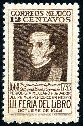 No. Scott: 791 -- Año de Emisión: 1944 -- Valor facial: Doce Centavos -- Variedad de color: Café -- Perforación: 10 x 101/2 -- Tipo de impresión: Grabado Timbre Postal Mexicano en color café, en el se observa al Dr. Juan Ignacio Maria de Castorena, periodista mexicano fundador del primer periódico en México, en la parte superior aparece escrito "CORREOS MEXICO", "12 CENTAVOS", en la parte inferior "III Feria del Libro (Octubre de 1944)". Para más información favor de dirigirse a biblioteca@mufi.org.mx