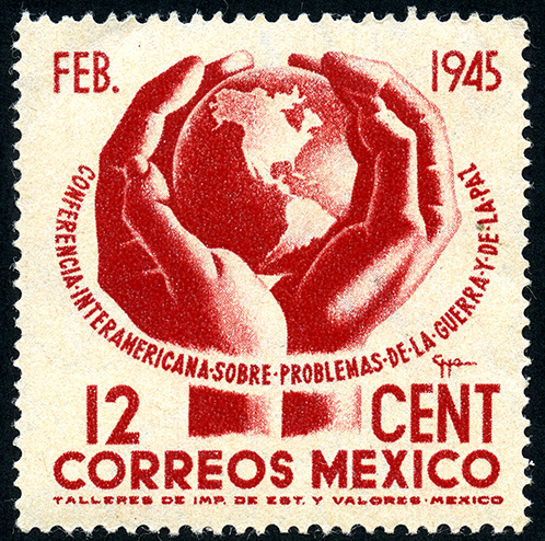 No. Scott: 792 -- Año de Emisión: 1945 -- Valor facial: Doce Centavos -- Variedad de color: Rojo Oscuro -- Perforación: 12 x 13 -- Tipo de impresión: Grabado Timbre Postal Mexicano en color rojo oscuro, en él se observan unas manos sosteniendo un globo terráqueo y el continente americano, alrededor de la imagen aparece la leyenda "CONFERENCIA INTERAMERICANA SOBRE PROBLEMAS DE LA GUERRA Y DE LA PAZ", en la parte inferior el valor facial y "CORREOS MEXICO" . Para más información favor de dirigirse a biblioteca@mufi.org.mx