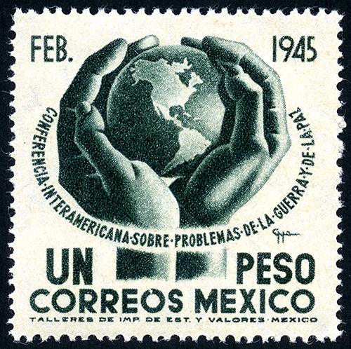 No. Scott: 793 -- Año de Emisión: 1945 -- Valor facial: Un Peso -- Variedad de color: Verde -- Perforación: 12 x 13 -- Tipo de impresión: Grabado Timbre Postal Mexicano en color verde, en él se observan unas manos sosteniendo un globo terráqueo y el continente americano, alrededor de la imagen aparece la leyenda "CONFERENCIA INTERAMERICANA SOBRE PROBLEMAS DE LA GUERRA Y DE LA PAZ", en la parte inferior el valor facial y "CORREOS MEXICO" . Para más información favor de dirigirse a biblioteca@mufi.org.mx