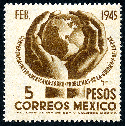 No. Scott: 794 -- Año de Emisión: 1945 -- Valor facial: Cinco Pesos -- Variedad de color: Café Olivo -- Perforación: 12 x 13 -- Tipo de impresión: Grabado Timbre Postal Mexicano en color café olivo, en él se observan unas manos sosteniendo un globo terráqueo y el continente americano, alrededor de la imagen aparece la leyenda "CONFERENCIA INTERAMERICANA SOBRE PROBLEMAS DE LA GUERRA Y DE LA PAZ", en la parte inferior el valor facial y "CORREOS MEXICO" . Para más información favor de dirigirse a biblioteca@mufi.org.mx
