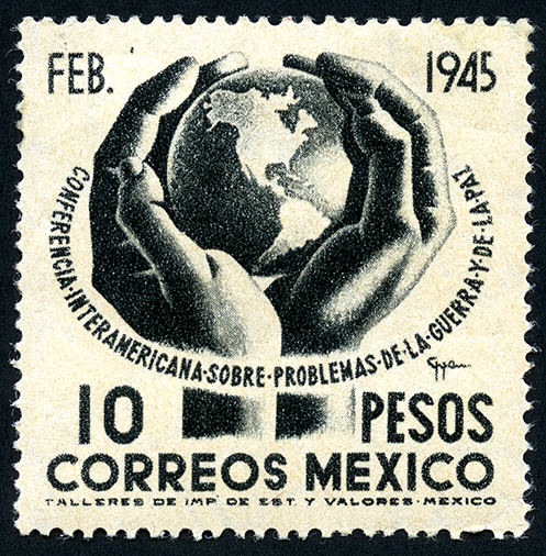 No. Scott: 795 -- Año de Emisión: 1945 -- Valor facial: Diez Pesos -- Variedad de color: Negro -- Perforación: 12 x 13 -- Tipo de impresión: Grabado Timbre Postal Mexicano en color negro, en él se observan unas manos sosteniendo un globo terráqueo y el continente americano, alrededor de la imagen aparece la leyenda "CONFERENCIA INTERAMERICANA SOBRE PROBLEMAS DE LA GUERRA Y DE LA PAZ", en la parte inferior el valor facial y "CORREOS MEXICO" . Para más información favor de dirigirse a biblioteca@mufi.org.mx