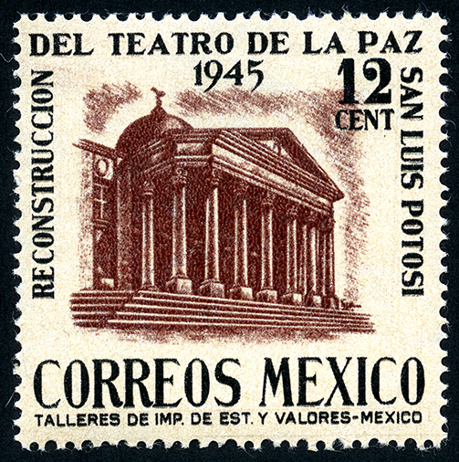 No. Scott: 801 -- Año de Emisión: 1945 -- Valor facial: Doce Centavos -- Variedad de color: Negro y Café Violeta -- Perforación: 12 x 13 -- Tipo de impresión: Grabado Timbre Postal Mexicano en colores negro y café violeta, en él se observa la fachada de un edificio histórico, perteneciente al estado de San Luis Potosí, en el contorno de la imagen de la parte superior aparece escrito "RECONSTRUCCION DEL TEATRO DE LA PAZ SAN LUIS POTOSI", "12 CENT" y en la parte inferior "CORREOS MEXICO". Para más información favor de dirigirse a biblioteca@mufi.org.mx