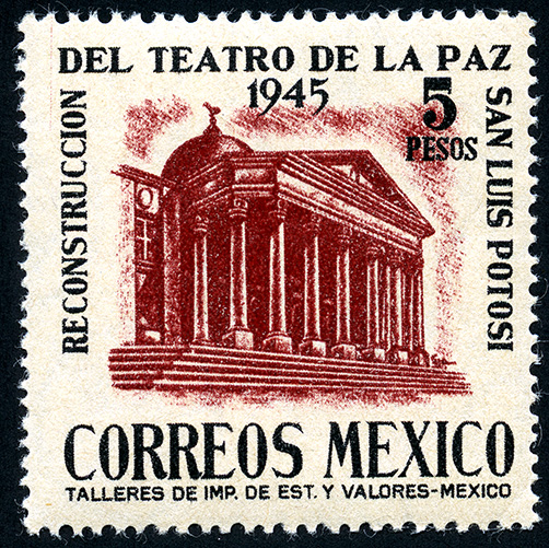 No. Scott: 803 -- Año de Emisión: 1945 -- Valor facial: Cinco Pesos -- Variedad de color: Negro y Café Rojizo -- Perforación: 12 x 13 -- Tipo de impresión: Grabado Timbre Postal Mexicano en colores negro y café rojizo, en él se observa la fachada de un edificio histórico, perteneciente al estado de San Luis Potosí, en el contorno de la imagen de la parte superior aparece escrito "RECONSTRUCCION DEL TEATRO DE LA PAZ SAN LUIS POTOSI", "5 PESOS" y en la parte inferior "CORREOS MEXICO". Para más información favor de dirigirse a biblioteca@mufi.org.mx