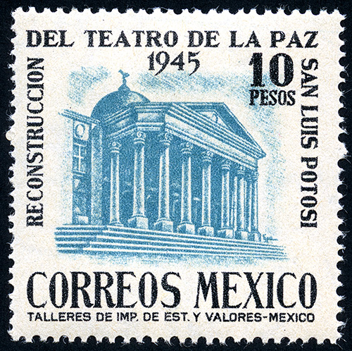 No. Scott: 804 -- Año de Emisión: 1945 -- Valor facial: Diez Pesos -- Variedad de color: Negro y Azul Verdoso -- Perforación: 12 x 13 -- Tipo de impresión: Grabado Timbre Postal Mexicano en colores negro y azul verdoso, en él se observa la fachada de un edificio histórico, perteneciente al estado de San Luis Potosí, en el contorno de la imagen de la parte superior aparece escrito "RECONSTRUCCION DEL TEATRO DE LA PAZ SAN LUIS POTOSI", "DIEZ PESOS" y en la parte inferior "CORREOS MEXICO". Para más información favor de dirigirse a biblioteca@mufi.org.mx