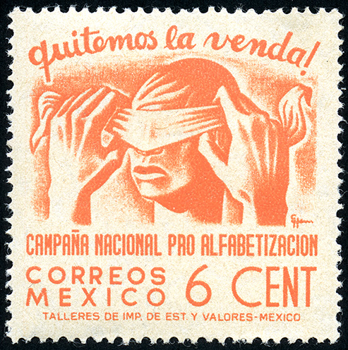No. Scott: 807 -- Año de Emisión: 1945 -- Valor facial: Seis Centavos -- Variedad de color: Naranja -- Perforación: 12 x 13 -- Tipo de impresión: Grabado Timbre Postal Mexicano en color naranja, en él se observa una cabeza humana con los ojos vendados y dos manos quitándole la venda, en la parte superior aparece escrito "QUITEMOS LA VENDA" y en la parte inferior "CAMPAÑA NACIONAL PRO-ALFABETIZACION", "CORREOS MEXICO" y el valor facial de "6 CENT". Para más información favor de dirigirse a biblioteca@mufi.org.mx