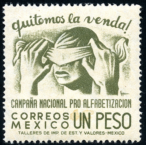 No. Scott: 809 -- Año de Emisión: 1945 -- Valor facial: Un Peso -- Variedad de color: Verde Olivo -- Perforación: 12 x 13 -- Tipo de impresión: Grabado Timbre Postal Mexicano en color verde olivo, en él se observa una cabeza humana con los ojos vendados y dos manos quitándole la venda, en la parte superior aparece escrito "QUITEMOS LA VENDA" y en la parte inferior "CAMPAÑA NACIONAL PRO-ALFABETIZACION", "CORREOS MEXICO" y el valor facial de "UN PESO". Para más información favor de dirigirse a biblioteca@mufi.org.mx