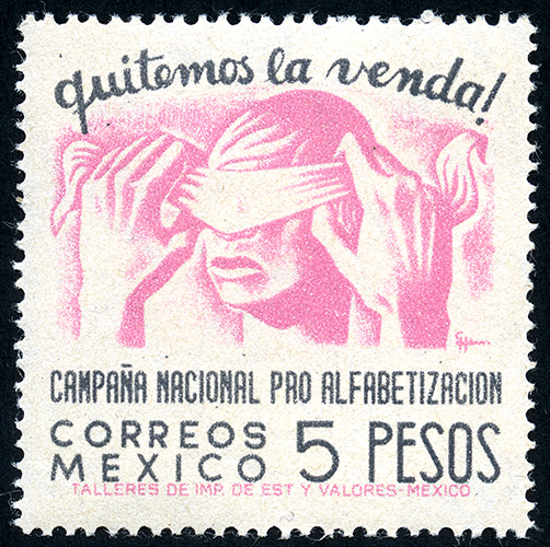 No. Scott: 810 -- Año de Emisión: 1945 -- Valor facial: Cinco Pesos -- Variedad de color: Gris Rosa -- Perforación: 12 x 13 -- Tipo de impresión: Grabado Timbre Postal Mexicano en colores gris y rosa, en él se observa una cabeza humana con los ojos vendados y dos manos quitándole la venda, en la parte superior aparece escrito "QUITEMOS LA VENDA" y en la parte inferior "CAMPAÑA NACIONAL PRO-ALFABETIZACION", "CORREOS MEXICO" y el valor facial de "5 PESOS". Para más información favor de dirigirse a biblioteca@mufi.org.mx