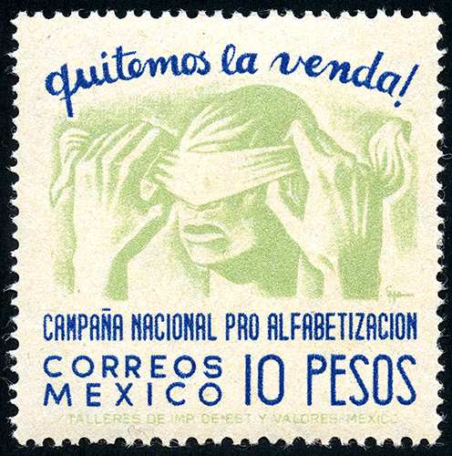 No. Scott: 811 -- Año de Emisión: 1945 -- Valor facial: Diez Pesos -- Variedad de color: Azul y Verde Amarillento -- Perforación: 12 x 13 -- Tipo de impresión: Grabado Timbre Postal Mexicano en colores azul y verde amarillento, en él se observa una cabeza humana con los ojos vendados y dos manos quitándole la venda, en la parte superior aparece escrito "QUITEMOS LA VENDA" y en la parte inferior "CAMPAÑA NACIONAL PRO-ALFABETIZACION", "CORREOS MEXICO" y el valor facial de "10 PESOS". Para más información favor de dirigirse a biblioteca@mufi.org.mx