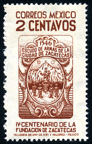 No. Scott: 820 -- Año de Emisión: 1946 -- Valor facial: Dos Centavos -- Variedad de color: Café Naranja -- Perforación: 14 -- Tipo de impresión: Grabado Timbre Postal Mexicano en color café y naranja, en la parte central de la imagen se observa el escudo de armas de la ciudad de Zacatecas, en la parte superior aparece escrito "CORREOS MEXICO", "2 CENTAVOS" y en la parte inferior "IV CENTENARIO DE LA FUNDACION DE ZACATECAS". Para más información favor de dirigirse a biblioteca@mufi.org.mx