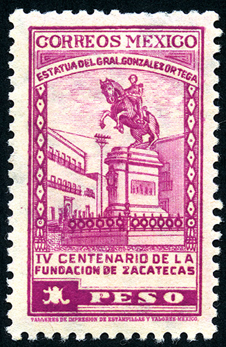 No. Scott: 822 -- Año de Emisión: 1946 -- Valor facial: Un Peso -- Variedad de color: Rosa Lila -- Perforación: 10 1/2 -- Tipo de impresión: Grabado Timbre Postal Mexicano en color rosa lila, en la imagen se observa la estatua del General González Ortega, en la parte superior aparece escrito "CORREOS MEXICO" y en la parte inferior la leyenda "IV CENTENARIO DE LA FUNDACION DE ZACATECAS" y el valor facial de "1 PESO". Para más información favor de dirigirse a biblioteca@mufi.org.mx