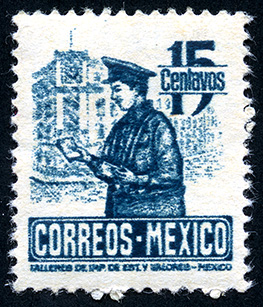 No. Scott: 825 -- Año de Emisión: 1947 -- Valor facial: Qunce Centavos -- Variedad de color: Azul Verdoso -- Perforación: 14 -- Tipo de impresión: Grabado Timbre Postal Mexicano en color azul verdoso, en la parte frontal de la imagen se observa a una persona de sexo masculino vestido de cartero y atrás de él un edificio, en la parte superior derecha aparece el valor facial de "15 CENTAVOS" y en el inferior aparece la leyenda "CORREOS MEXICO". Para más información favor de dirigirse a biblioteca@mufi.org.mx
