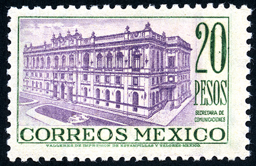 No. Scott: 829 -- Año de Emisión: 1947 -- Valor facial: Veinte Pesos -- Variedad de color: Verde y Lila -- Perforación: 10 1/2 x 10 -- Tipo de impresión: Grabado Timbre Postal Mexicano en colores verde y lila , en la imagen se observa el antíguo Palacio de la Secretaría de Comunicaciones, edifício antiguo perteneciente al estado de México, también se observa el valor facial de "20 PESOS", "SECRETARÍA DE COMUNICACIONES" y "CORREOS MÉXICO". Para más información favor de dirigirse a biblioteca@mufi.org.mx