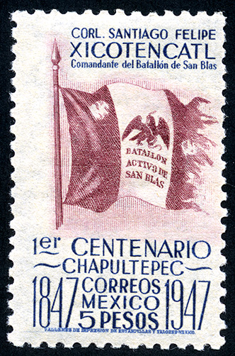 No. Scott: 836 -- Año de Emisión: 1947 -- Valor facial: Cinco Pesos -- Variedad de color: Azul Oscuro y Rojo Vino -- Perforación: 10 x 10 1/2 -- Tipo de impresión: Grabado Timbre Postal Mexicano en colores verde azul oscuro y rojo vino, en la imagen se observa la bandera del batallón activo de San Blas, en la parte superior aparece escrito "CORL.SANTIAGO FELIPE XICOTENCATL" y en la parte inferior "1er CENTENARIO CHAPULTEPEC", "CORREOS MEXICO" y el valor facial de "5 PESOS". Para más información favor de dirigirse a biblioteca@mufi.org.mx