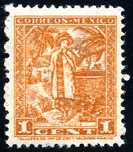 Timbre Postal Mexicano en color naranja, en el se observa a una mujer indígena, ella está de pie, lleva puesto un huipil y una falda, en la cabeza porta un rodete y en la espalda va cargando un cántaro, en la parte superior de la imagen está escrito "CORREOS MEXICO" y en la parte inferior el valor facial de "1 CENTAVO". Para más información favor de dirigirse a biblioteca@mufi.org.mx No. Scott: 837 -- Año de Emisión: 1947-1950 -- Valor facial: Un Centavo -- Variedad de color: Naranja -- Perforación: 14 -- Tipo de impresión: Grabado