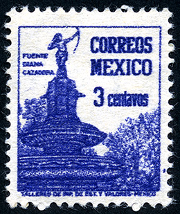 No. Scott: 839 -- Año de Emisión: 1947-1950 -- Valor facial: Tres Centavos -- Variedad de color: Azul Violáceo -- Perforación: 14 -- Tipo de impresión: Grabado Timbre Postal Mexicano en color azul violáceo, en él se observa la fuente de La Diana Cazadora, en la parte superior aparece escrito "FUENTE DIANA CAZADORA", "CORREOS MEXICO" y el valor facial de "3 CENTAVOS". Para más información favor de dirigirse a biblioteca@mufi.org.mx
