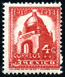 No. Scott: 840 -- Año de Emisión: 1947-1950 -- Valor facial: Cuatro Centavos -- Variedad de color: Rojo -- Perforación: 14 -- Tipo de impresión: Grabado Timbre Postal Mexicano en color rojo, en él se observa el monumento a la Revolución Mexicana, en la parte superior aparece escrito "1910-1934 y en la parte inferor "CORREOS MEXICO" y el valor facial de "4 CENTAVOS". Para más información favor de dirigirse a biblioteca@mufi.org.mx
