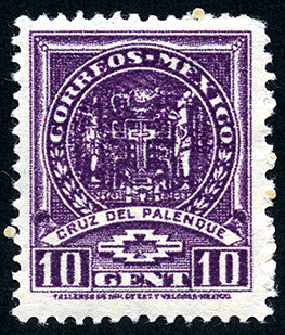 No. Scott: 844 -- Año de Emisión: 1947-1950 -- Valor facial: Diez Centavos -- Variedad de color: Violeta -- Perforación: 14 -- Tipo de impresión: Grabado Timbre Postal Mexicano en color violeta, en él se observa el Monumento de Cruz de Palenque, escultura histórica perteneciente al Estado de Chiapas, esta imagen se centra en un marco ornamentado, en la parte superior aparece escrito"CORREOS-MEXICO" y en la parte inferior "CRUZ DE PALENQUE" y el valor facial de "10 CENTAVOS". Para más información favor de dirigirse a biblioteca@mufi.org.mx