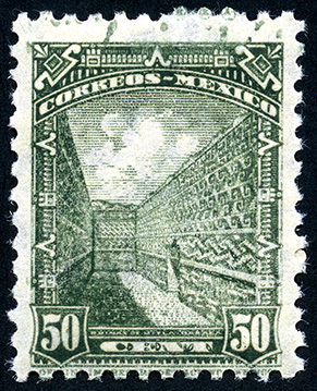 No. Scott: 849 -- Año de Emisión: 1947-1950 -- Valor facial: Cincuenta Centavos -- Variedad de color: Verde -- Perforación: 10 1/2 -- Tipo de impresión: Grabado Timbre Postal Mexicano en color verde, en él se observa la zona arqueológica de Mitla, perteneciente al estado de Oaxaca, esta imagen se centra en un marco ornamentado, en la parte superior aparece escrito "CORREOS MEXICO" y en la parte inferior el valor facial de "50 CENTAVOS" . Para más información favor de dirigirse a biblioteca@mufi.org.mx