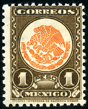 No. Scott: 850 -- Año de Emisión: 1947-1950 -- Valor facial: Un Peso -- Variedad de color: Café y Naranja -- Perforación: 10 1/2 -- Tipo de impresión: Grabado Timbre Postal Mexicano en colores café y naranja, en él se observa a una águila parada en un nopal, devorando a una serpiente, la cual se centra en un marco ornamentado, en la parte superior está escrito "CORREOS", y en la parte inferior el valor facial de "UN PESO" y "MEXICO". Para más información favor de dirigirse a biblioteca@mufi.org.mx