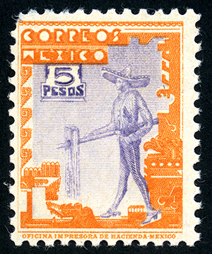 No. Scott: 851 -- Año de Emisión: 1947-1950 -- Valor facial: Cinco Pesos -- Variedad de color: Naranja y Violeta -- Perforación: 10 1/2 -- Tipo de impresión: Grabado Timbre Postal Mexicano en colores naranja y violeta, en él se observa a una persona del sexo masculino, vestido con sombrero ancho, pantalón, chaqueta y zapatos, en la parte superior aparece escrito "CORREOS MEXICO" y el valor facial de "5 CENTAVOS". Para más información favor de dirigirse a biblioteca@mufi.org.mx