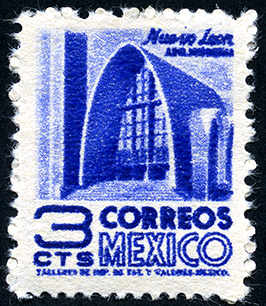 No. Scott: 856 -- Año de Emisión: 1950-1952 -- Valor facial: Tres Centavos -- Variedad de color: Azul Violeta -- Perforación: 14 -- Tipo de impresión: Grabado Timbre Postal Mexicano en color azul violeta, en la imagen se observa la cúpula de un edificio histórico lo que a mi parecer podría ser la cúpula de una iglesia, en la parte superior está escrito "NUEVO LEON", "ARQUITECTURA", en la parte inferior "CORREOS MEXICO" y el valor facial de "3 CTS".