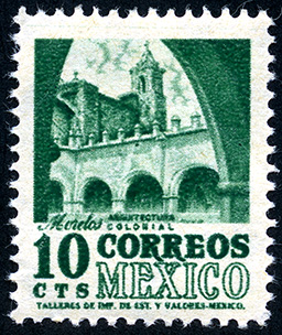 No. Scott: 858 -- Año de Emisión: 1950-1952 -- Valor facial: Diez Centavos -- Variedad de color: Verde Oscuro -- Perforación: 14 -- Tipo de impresión: Grabado Timbre Postal Mexicano en color verde oscuro, en la imagen se observa el Convento Dominico, La Natividad, edificio histórico perteneciente al Estado de Morelos, en la parte inferior está escrito "CORREOS MEXICO" y el valor facial de "10 CTS". Para más información favor de dirigirse a biblioteca@mufi.org.mx