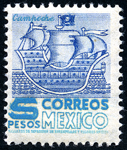 Galeón Pirata del siglo XVI Estado de Campeche -- Con marca de Agua: GOBIERNO MEXICANO Y ÁGUILA EN CÍRCULO ( XV ) -- Grabado -- Con Perforación -- Cinco Pesos -- Ultramarino y Verde Azulado
