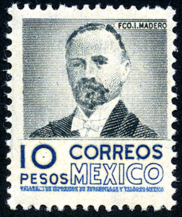 No. Scott: 866 -- Año de Emisión: 1950-1952 -- Valor facial: Diez Pesos -- Variedad de color: Negro, Azul Oscuro -- Perforación: 14 -- Tipo de impresión: Grabado Timbre Postal Mexicano en colores negro y azul oscuro, en la imagen se observa la efigie del Presidente Francisco Ignacio Madero, en la parte inferior aparece escrito "CORREOS MEXICO" y el valor facial de "10 PESOS". Para más información favor de dirigirse a biblioteca@mufi.org.mx
