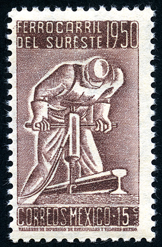 No. Scott: 870 -- Año de Emisión: 1950 -- Valor facial: Quince Centavos -- Variedad de color: Café Oscuro -- Perforación: 10 1/2 x 10 -- Tipo de impresión: Grabado Timbre Postal Mexicano en color café oscuro, en la imagen se observa a un trabajador ferrocarrilero, en la parte superior aparece escrito "FERROCARRIL DEL SURESTE 1950", en la parte inferior "CORREOS MEXICO" y el valor facial de "15 CTS " . Para más información favor de dirigirse a biblioteca@mufi.org.mx