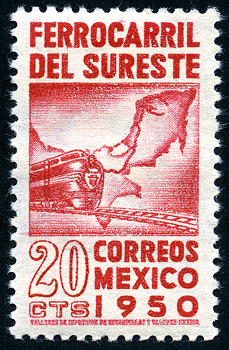 No. Scott: 871 -- Año de Emisión: 1950 -- Valor facial: Veinte Centavos -- Variedad de color: Rojo -- Perforación: 10 1/2 x 10 -- Tipo de impresión: Grabado Timbre Postal Mexicano en color rojo, en la imagen se observa un mapa del sureste de México y una locomotora, en la parte superior aparece escrito "FERROCARRIL DEL SURESTE", en la parte inferior "CORREOS MEXICO 1950" y el valor facial de "20 CTS " . Para más información favor de dirigirse a biblioteca@mufi.org.mx