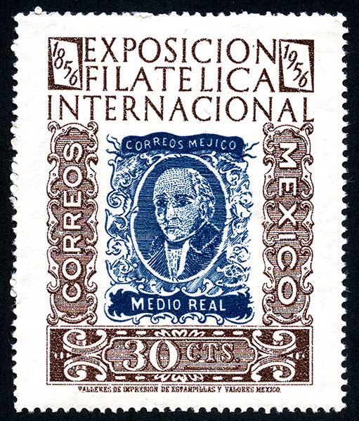 Primer Timbre Postal de México de 1856. -- Con marca de Agua: MEX-MEX Y ÁGUILA EN CÍRCULO ABIERTO EN POSICIÓN VERTICAL ( XVI ) -- Fotograbado -- Con Perforación -- Treinta Centavos -- Café y Azul