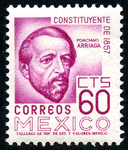 Constituyentes de 1857 Ponciano Arriaga. -- Con marca de Agua: MEX-MEX Y ÁGUILA EN CÍRCULO ABIERTO EN POSICIÓN VERTICAL ( XVI ) -- Fotograbado -- Con Perforación -- Sesenta Centavos -- Rosa Oscuro
