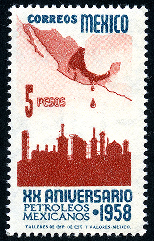 Mapa de México con zona Petrolera y Refinería -- Con marca de Agua: MEX-MEX Y ÁGUILA EN CÍRCULO ABIERTO EN POSICIÓN VERTICAL ( XVI ) -- Fotograbado -- Con Perforación -- Cinco Pesos -- Café Rojizo y Azul Prusia